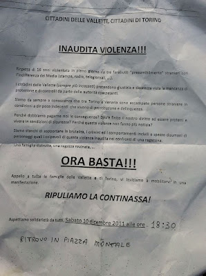 Ma a leggere il volantino (io l'ho ripreso da uno storify di Arianna Ciccone, che riflette sulla fabbrica del falso e sui dispositivi del pregiudizio) non c'è nessuna firma. Sicuramente tra i partecipanti al raid ci sono stati (anche) degli ultrà: perché nelle periferie metropolitane la curva è uno dei pochi momenti di socializzazione e da anni una delle poche occasioni di scontri di piazza è l'appuntamento domenicale allo stadio. E negli scontri di piazza sicuramente si distinguono più gli elementi facinorosi e allenati (ma spuntano anche i 'Pelliccia' di turno) che i volontari ospedalieri: comunque a scatenare la teppa non è stato il comando di qualche capetto ma un grumo di frustrazione e risentimento che ha radici profonde. Le bugie della ragazzina hanno solo fatto saltare il tappo di una forte esasperazione, a prescindere dal singolo episodio. Tant'è che al corteo, comunque arrabbiato, c'erano donne e bamboini, e pure la segretaria provinciale del Pd. Mi spiega un collega torinese: